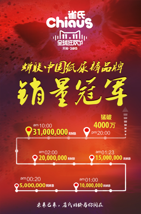 歷時(shí)24小時(shí)的11.11狂歡購(gòu)終于精彩謝幕!作為中國(guó)紙尿褲領(lǐng)導(dǎo)品牌,雀氏在2015年雙11中戰(zhàn)績(jī)一路攀升,屢創(chuàng)新高,再次勇奪中國(guó)紙尿褲品牌銷(xiāo)量魁首。