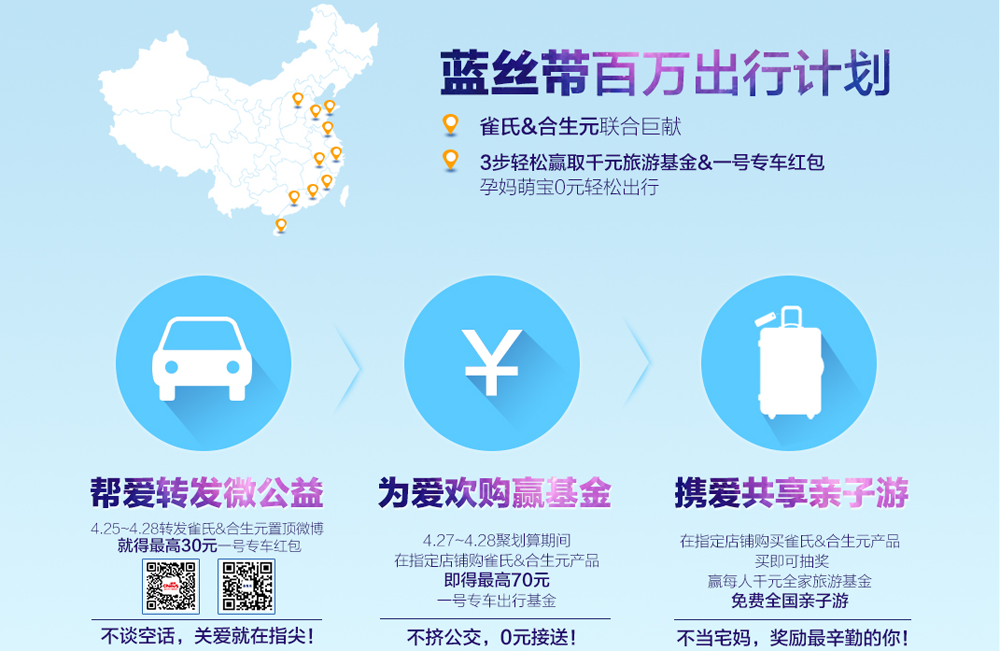 在中國(guó),每天新增216000位新媽媽。在分娩前,她們至少需要奔波20多個(gè)來(lái)回進(jìn)行產(chǎn)檢;在學(xué)齡前,他們至少需要帶寶寶接種22次疫苗。雀氏通過(guò)對(duì)孕婦及媽媽們?nèi)粘I畹目疾?,發(fā)現(xiàn)這一特殊群體日常出行時(shí)的不便利,針對(duì)這一特殊群體的特殊時(shí)期的痛點(diǎn)切入,提出“幫愛(ài)出行”的公益理念。首次跨界聯(lián)合四大品牌,推出“2015藍(lán)絲帶百萬(wàn)出行計(jì)劃”,呵護(hù)寶寶,更關(guān)注媽媽?zhuān)o予媽媽與準(zhǔn)媽媽們更多生活點(diǎn)滴的關(guān)注與關(guān)愛(ài),共同保護(hù)生命中最重要的人。