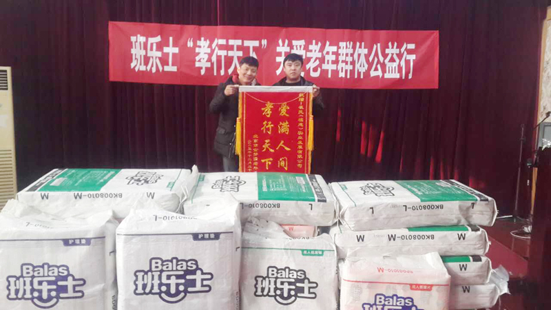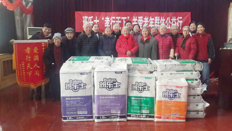 2015年4月18日,班樂士聯合中國老齡事業(yè)發(fā)展基金會發(fā)起孝行天下,關愛老年群體公益行系列活動。自項目啟動之日起,班樂士愛心公益捐贈活動走進全國十余家敬老院,為老人們送去了專為老年人研發(fā)設計的班樂士成人護理用品,用實際行動關懷著每一位老人。