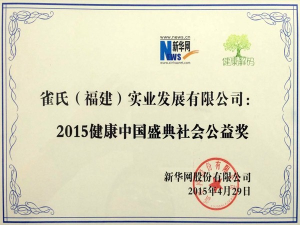 2015年,雀氏榮獲中國老年保健協(xié)會理事單位、中國老年保健協(xié)會成立二十周年突出貢獻(xiàn)獎。
