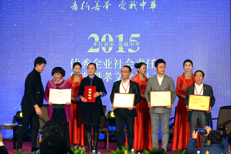 (圖為雀氏集團(tuán)代表(右3)接受“2015中國(guó)公益榜樣”授牌)