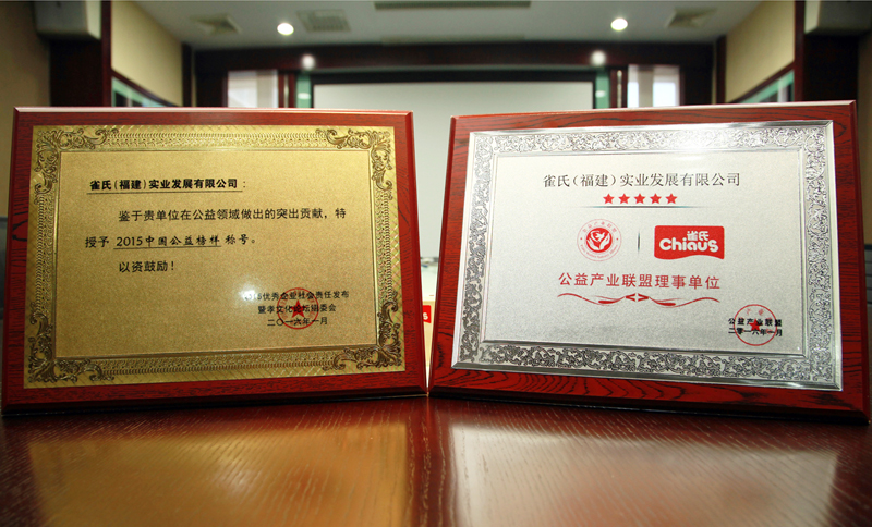 (圖為雀氏企業(yè)榮獲“2015中國(guó)公益榜樣”及“公益產(chǎn)業(yè)聯(lián)盟理事單位”)