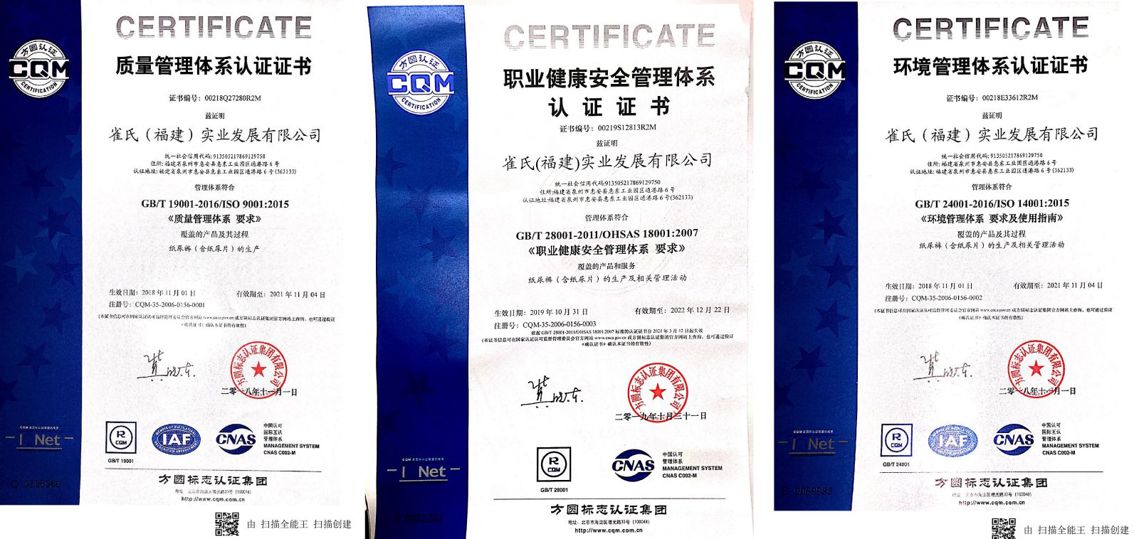 雀氏(福建)實業(yè)發(fā)展有限公司在生產(chǎn)運營中一貫重視對環(huán)境的保護,有相應管理組織,制定了“環(huán)境管理方針”對公司內影響環(huán)境的各種因素進行管理,完善各種環(huán)境管理制度,公司于2006年11月分別通過了北京方圓標志認證集團的ISO14001的環(huán)境管理體系、ISO9001的質量管理體系,2016年通過了OHSAS18001的職業(yè)健康安全管理體系認證。