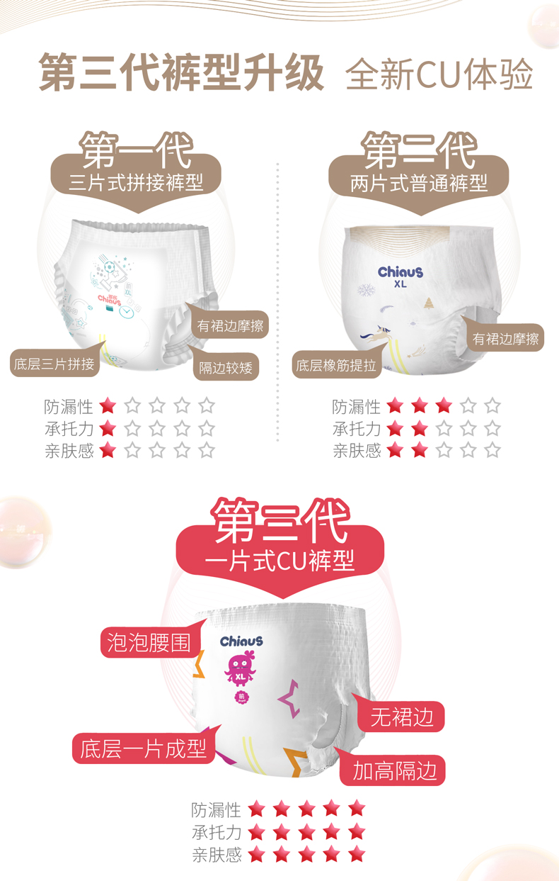 結(jié)合初代“三片式拼接褲型”及二代“二片式褲型”的研發(fā)經(jīng)驗(yàn),這一次,雀氏于業(yè)內(nèi)率先推陳出新,圍繞“防漏性”“承托力”“親膚感”3項(xiàng)核心指標(biāo)升級(jí)產(chǎn)品,一面凸顯品牌“新”意,一面為媽媽和寶貝的生活注入愛與驚喜。