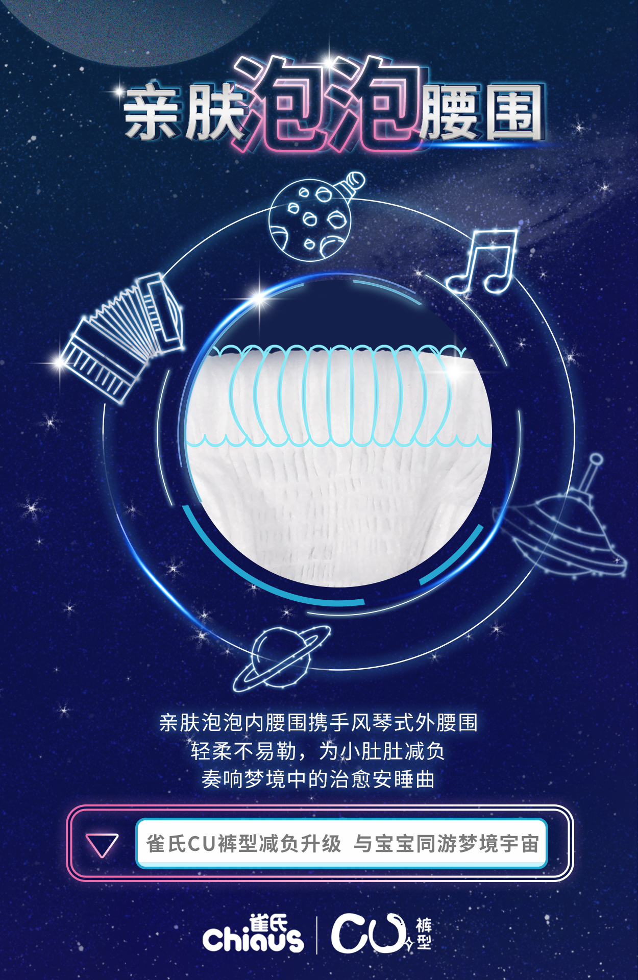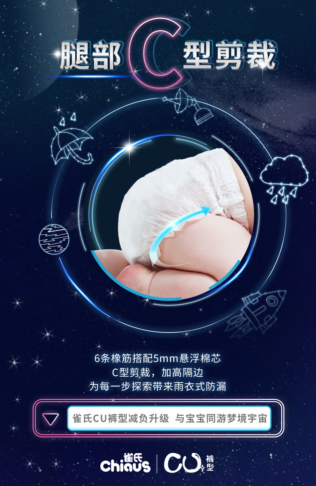 簡言之,C型裁剪 + U型輪廓,組合起來便是“雀氏CU褲型”——升級(jí)后的褲型命名,不僅方便消費(fèi)者記憶,更完美詮釋出其獨(dú)特的銷售主張。其三大設(shè)計(jì)亮點(diǎn),每一項(xiàng)都在為寶寶舒適生活加Buff,讓寶寶在其人生首次探索世界的過程中,能隨心而動(dòng),免受“屁事”干擾。