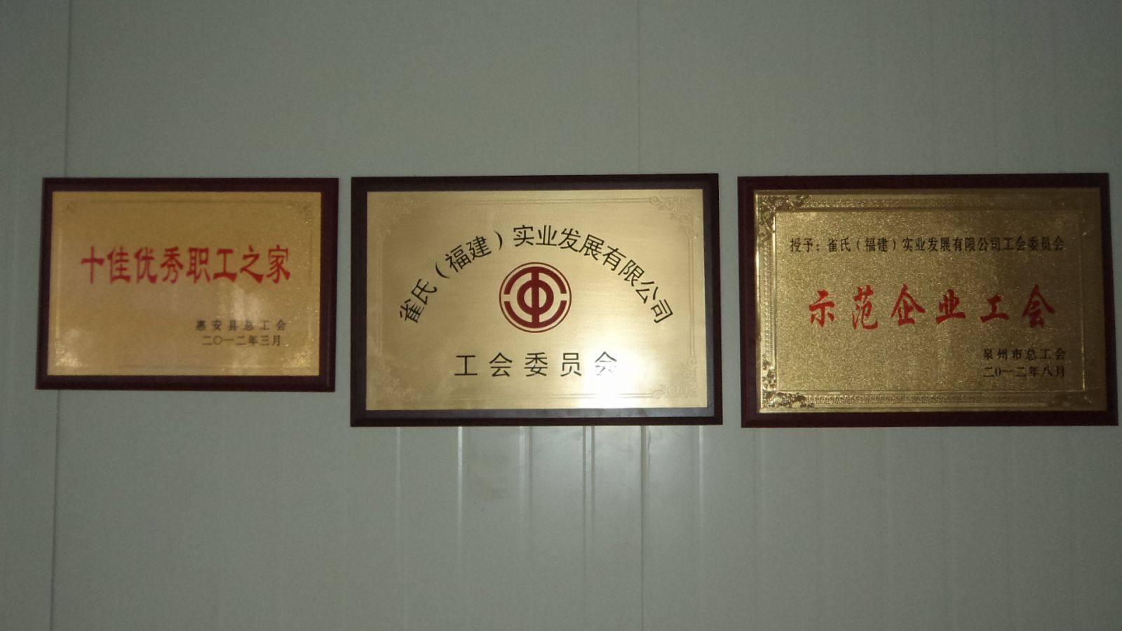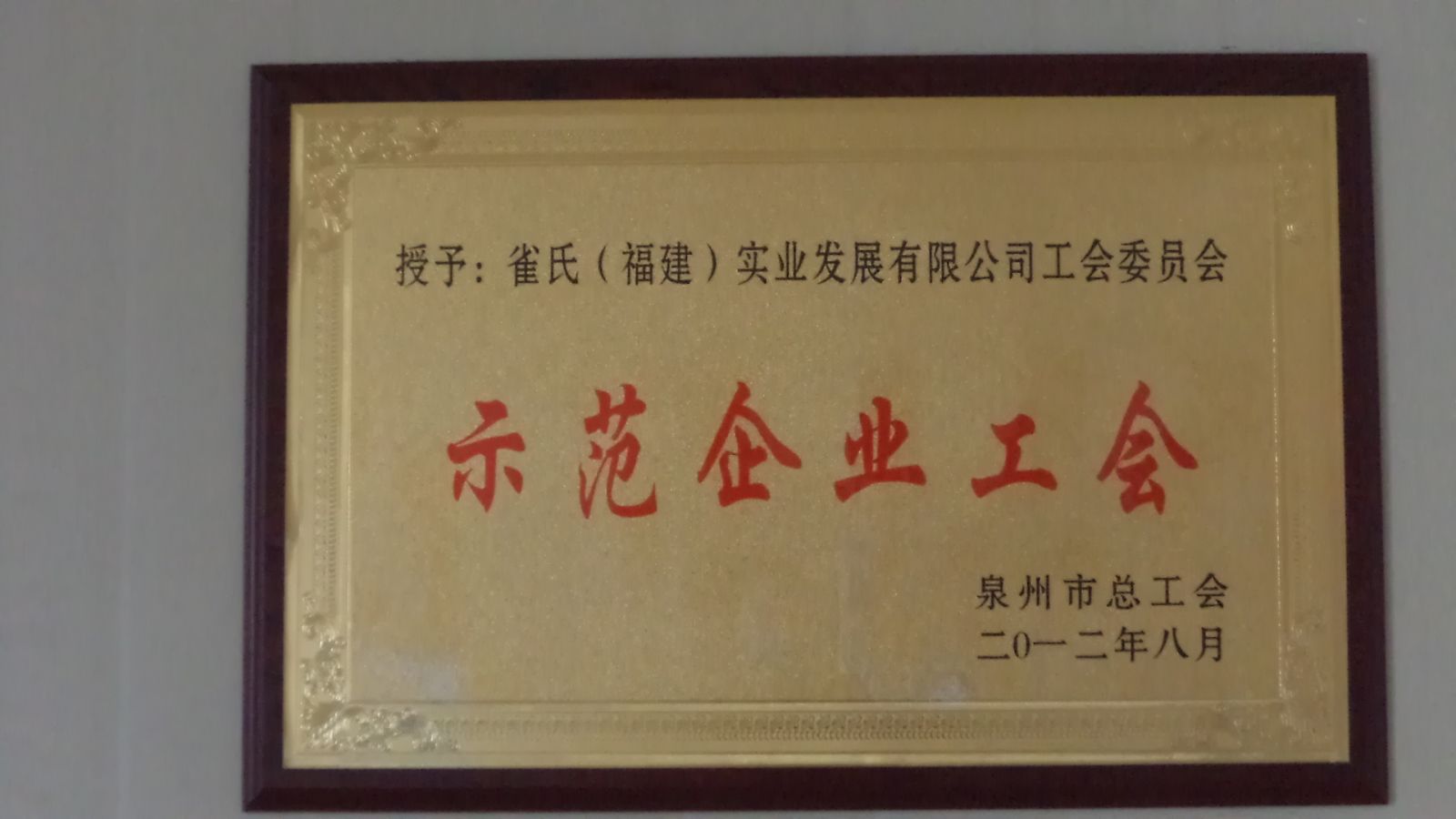 2012年8月雀氏工會榮獲泉州市總工會頒發(fā)的“泉州市示范企業(yè)工會”。全市僅50家非公有制企業(yè)工會獲此殊榮,市總工會對于我們的工作肯定,我們一定再接再厲,創(chuàng)造更好的成績,在職工和企業(yè)之間搭建良好的溝通橋梁,為企業(yè)的和諧發(fā)展做出更大的貢獻。